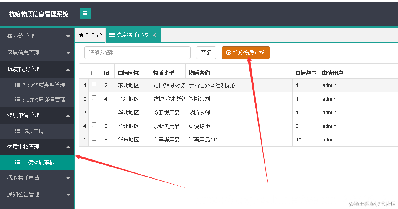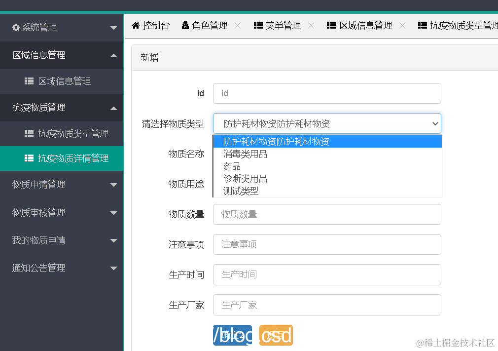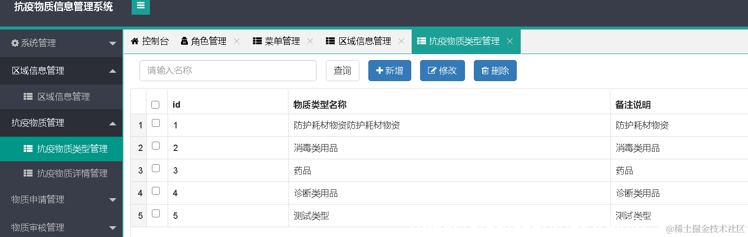 用户、区域、物质类型、物质详情、物质申请和审核以及我的申请和通知公告以及灵活控制菜单权限