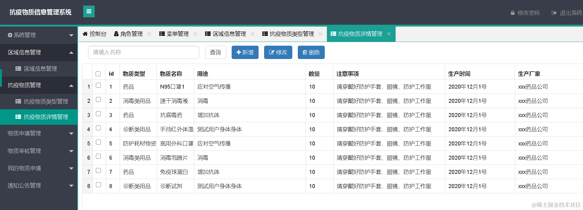 都能满足你的需求。原始Jsp、SSM、SpringBoot、以及HTML+CSS+JS页面设计, web大学生网页设计作业源码等等都可以参考得到解决。话不多说直接拿一个抗疫物质信息管理系统来举例