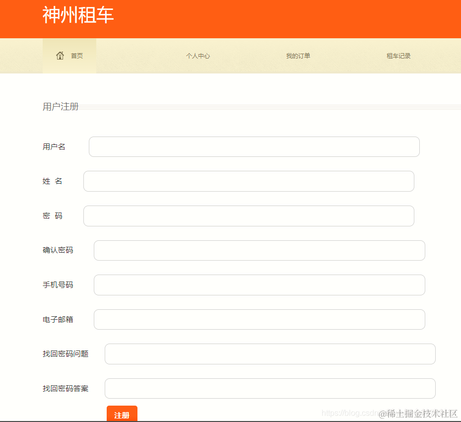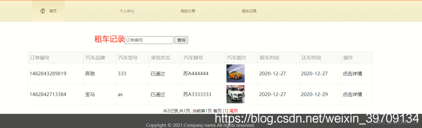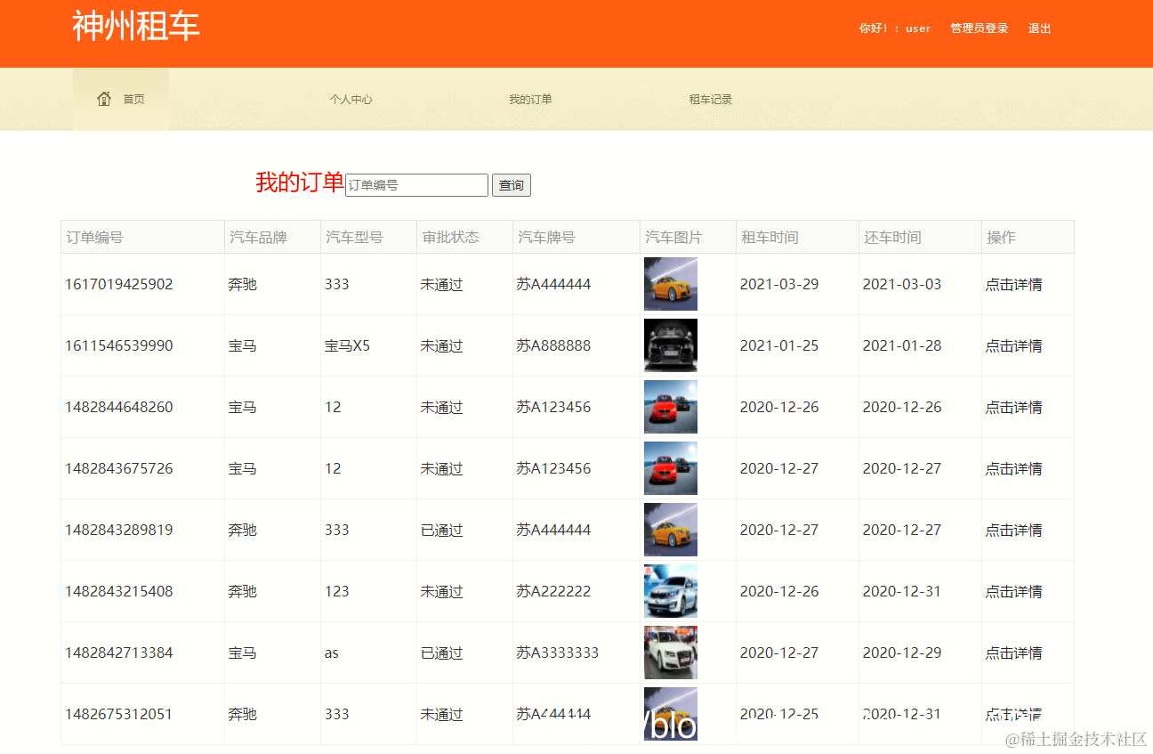 查看我的订单,查看个人租车记录,