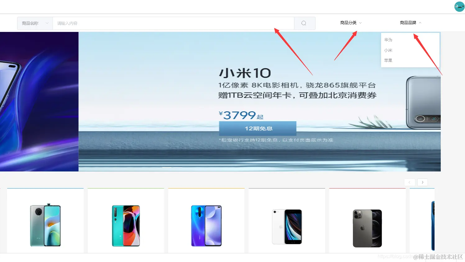 前端主页面:商品关键字搜索和分类搜索功能以及首页轮播图配置展示