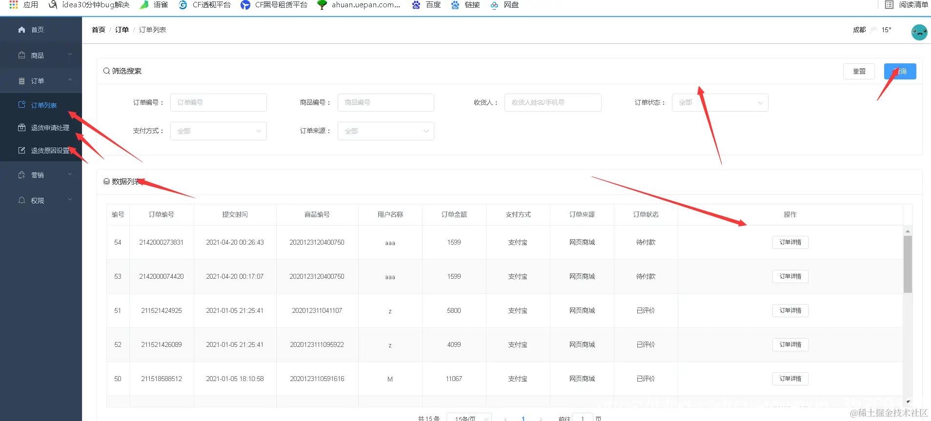 商品订单详情管理:根据关键字查询以及查看每一个订单的详情信息。