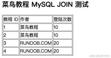 mysql> SELECT a.runoob_id, a.runoob_author, b.runoob_count FROM runoob_tbl a INNER JOIN tcount_tbl b ON a.runoob_author = b.runoob_author; +-------------+-----------------+----------------+ | a.runoob_id | a.runoob_author | b.runoob_count | +-------------+-----------------+----------------+ | 1 | 菜鸟教程 | 10 | | 2 | 菜鸟教程 | 10 | | 3 | RUNOOB.COM | 20 | | 4 | RUNOOB.COM | 20 | +-------------+-----------------+----------------+ 4 rows in set (0.00 sec)