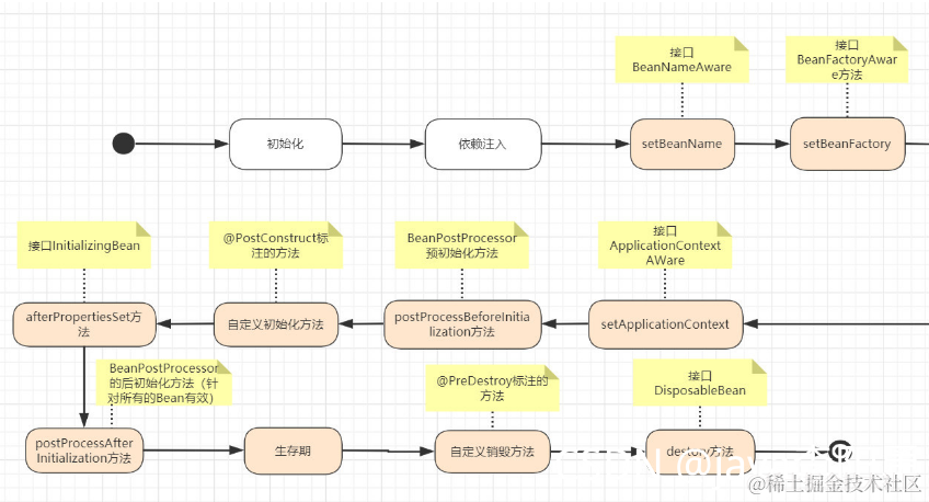> Spring Bean 的生命周期简单易懂。在一个 bean 实例被初始化时,需要执行一系列的初始化操作以达到可用的状态。同样的,当一个 bean 不在被调用时需要进行相关的析构操作,并从 bean 容器中移除。