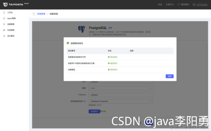 PostgreSQL 数据实时同步到 MongoDB、DM DB 达梦数据库、SQL Server、Elasticsearch 、MySQL、Kafka 的方式也都是先配置源和目标的连接,然后新建任务选择同步模式:全量/增量/全量+增量,因为步骤相同,其他就不再贴图说明了。创建连接的时候,有没有发现:DB2、Sybase、Gbase 几个数据库现在是灰色锁定状态,应该是在开发中了,可能后续也会支持这些数据库的同步功能。