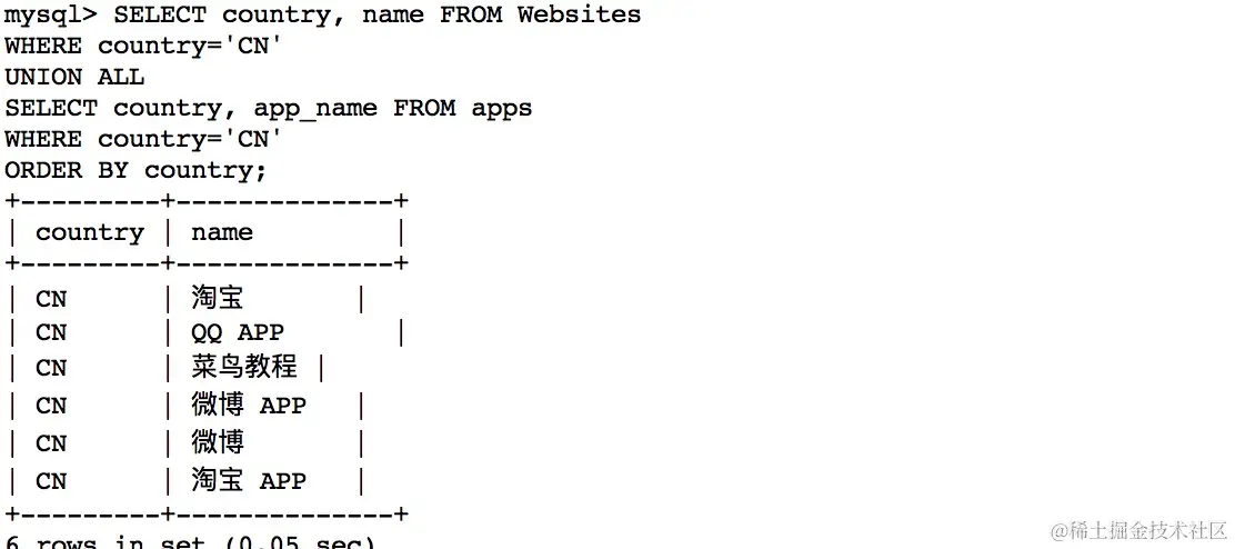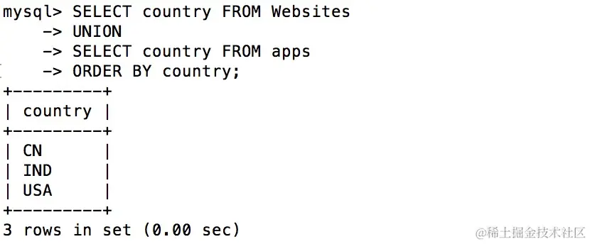 MySQL UNION 操作符用于连接两个以上的 SELECT 语句的结果组合到一个结果集合中。多个 SELECT 语句会删除重复的数据。