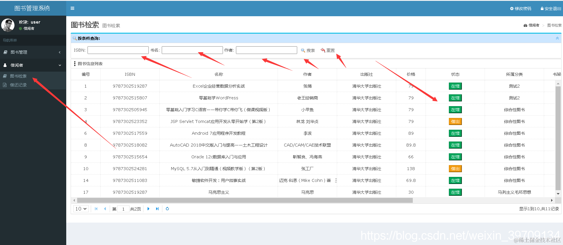 用户登录后可以查看自己的借阅记录、以及去借书和归还书籍等操