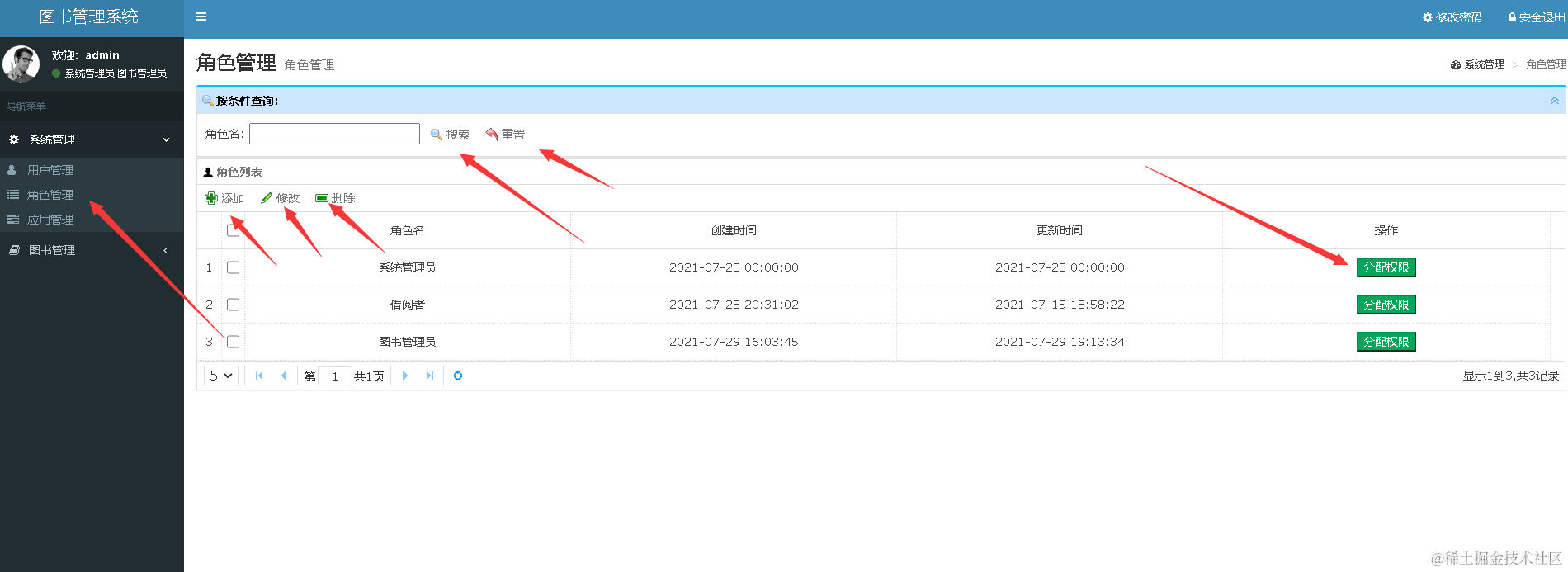 点击查看角色信息、以及模糊搜索和重置信息、添加修改角色信息、根据角色分配权限信息