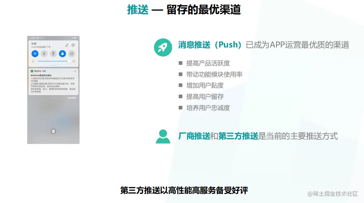 消息推送是电商平台达到精细化运营的重要工具,MobPush基于MobTech多年来深厚的大数据技术沉淀,助力App推送定位精准用户投放,实现老用户的高效唤醒。