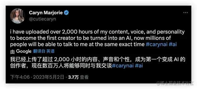 随后结合GPT-4技术,让用户能够在这场和AI的恋爱中“实现动态、独一无二的互动,好像是在直接和Caryn本人聊天一样。”
