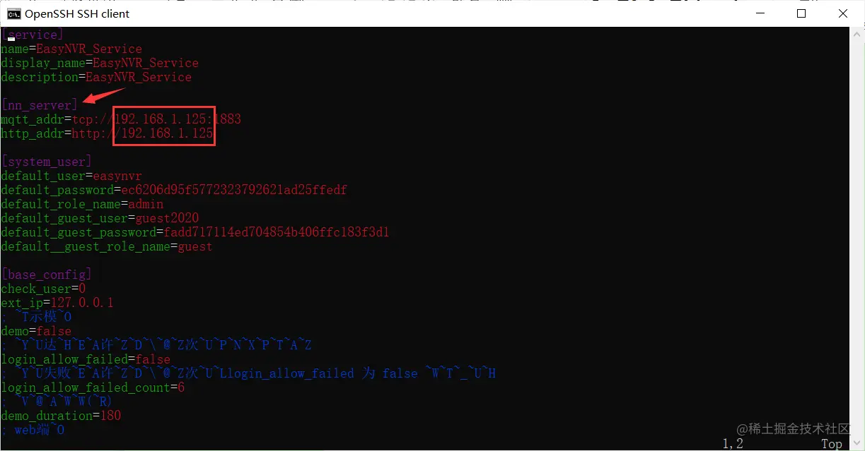 4)进入到此路径后,通过vi命令,编辑easynvr.ini文件。修改[nn_server]下面的http和mqtt的地址,地址填写该分析网关的IP地址。如: