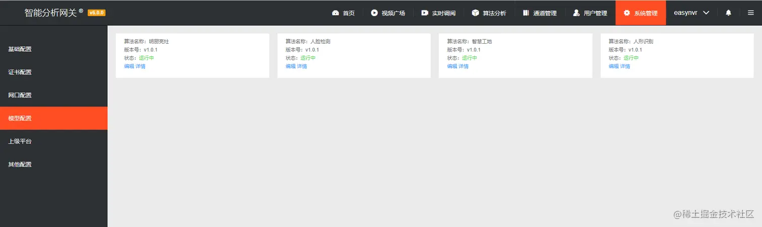1)进入系统后台后,点击【系统管理】—>【模型配置】,查看算法是否都已处于“运行中”的状态。