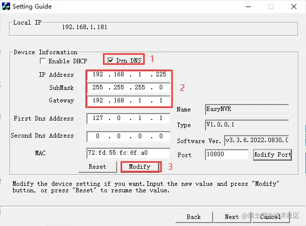 2)如需修改IP,可选中搜索到的IP地址,点击【Next】,输入要更改的IP地址参数,点击【Modify】,输入用户名和密码admin/manage,等待设备重启即可。