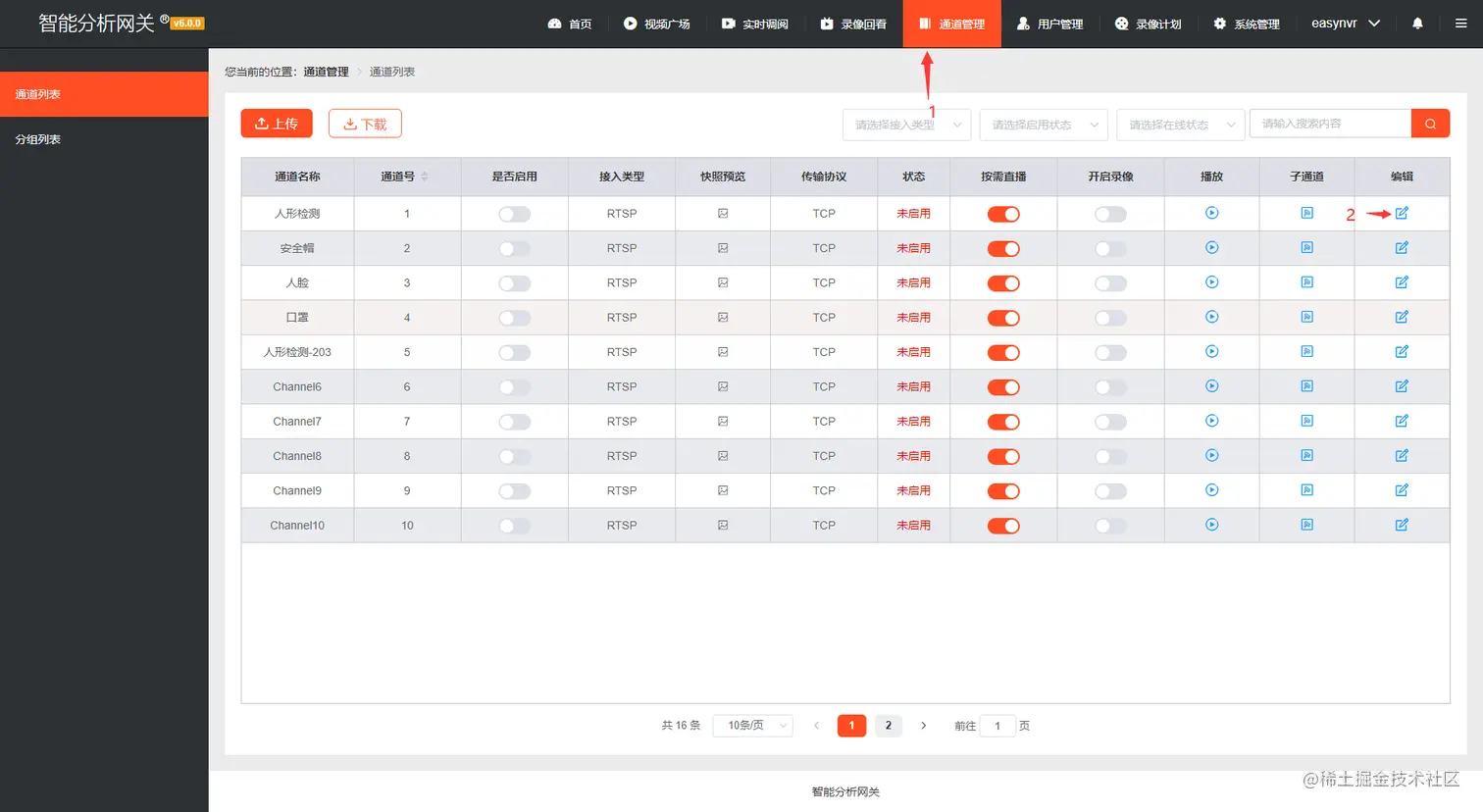 4)添加通道完成后,等待通道上线,点击通道后面的【算法类型】按钮,启用对应的算法,等待算法通道在线即可。