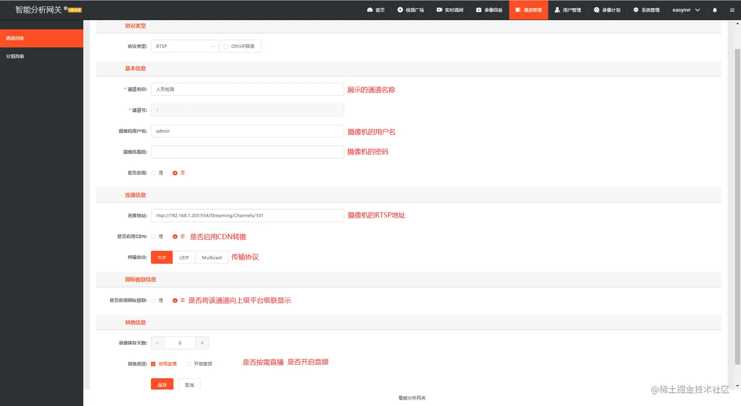 3)在通道管理内配置摄像机参数,如下图所示: