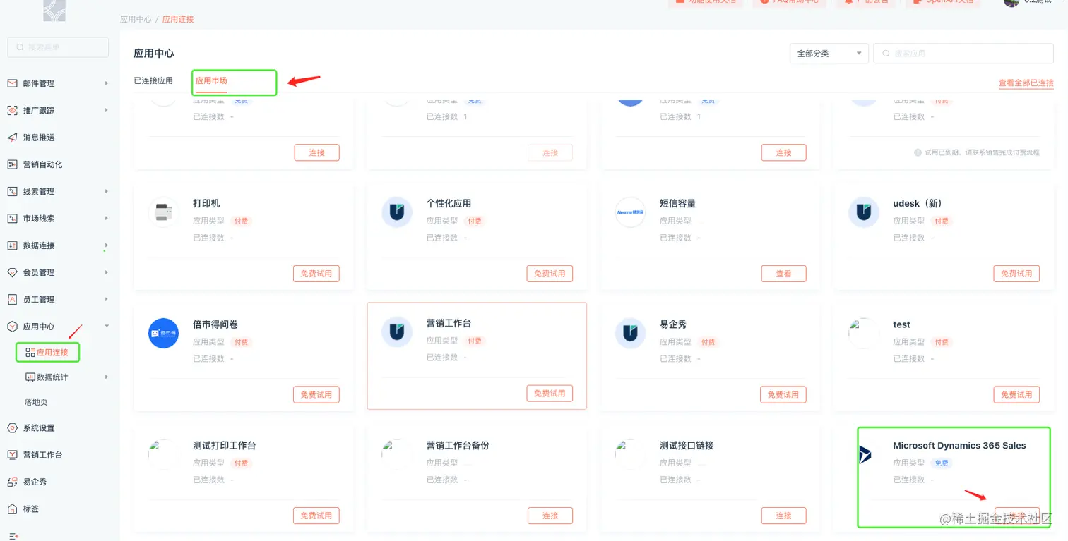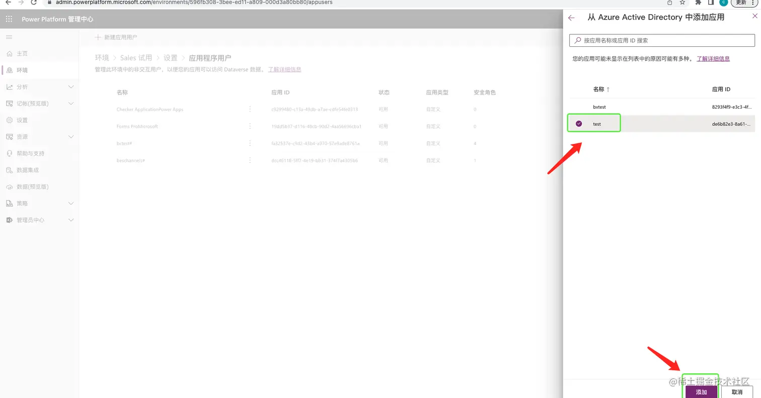 - 在PowerPlatform 平台关联Azure应用与Dynamics 365 Sales 的应用,配置相应权限。