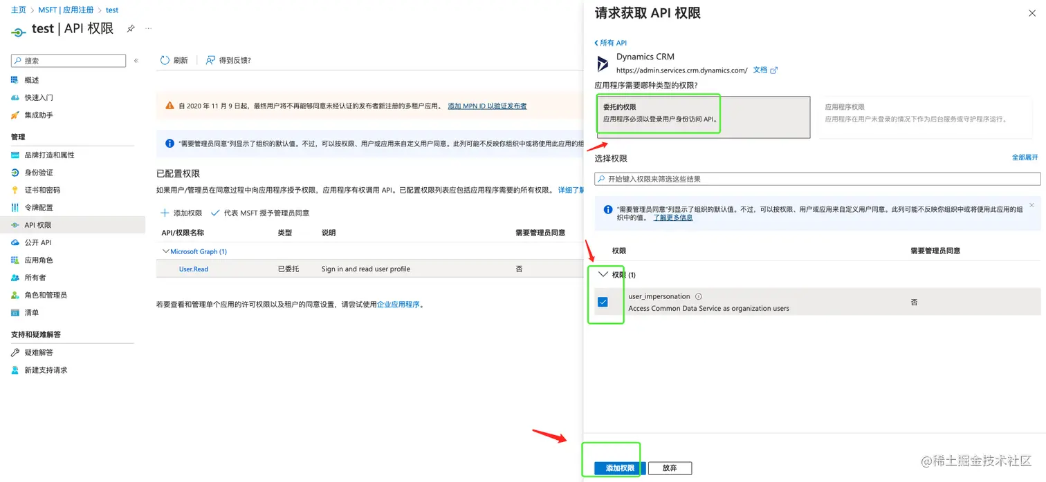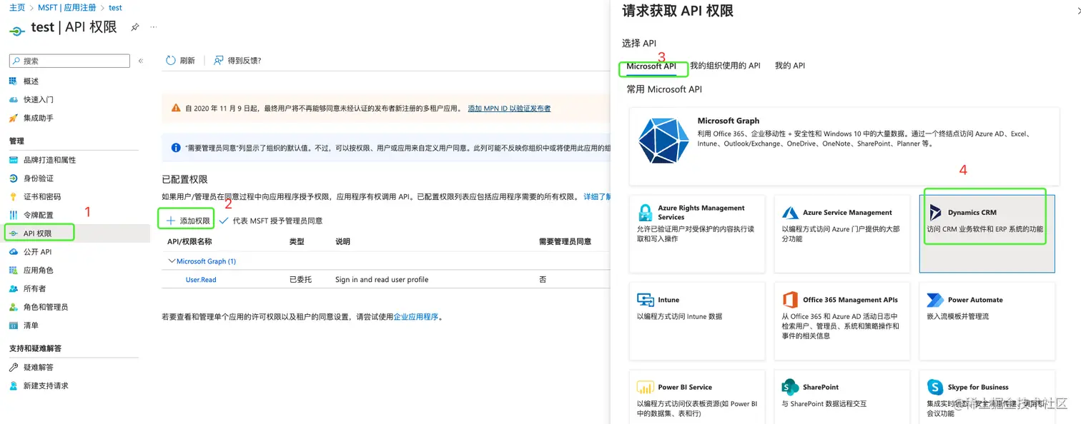 - 在Microsoft Azure 平台配置应用权限,保证有足够的权限获取Dynamics 365 Sales 的相关资源