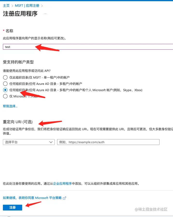 - 注册应用,录入名称,账户类型选择 "任何组织目录(任何 Azure AD 目录 - 多租户)中的帐户和个人 Microsoft 帐户(例如,Skype、Xbox) ",使用凭证式授权,重定向URL可以为空