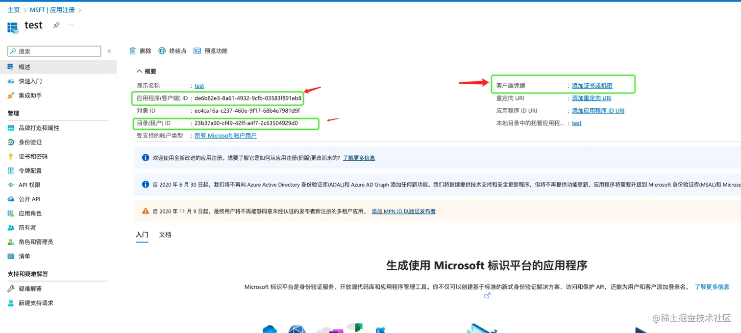 client_id:即Azure注册应用程序概述中的"应用程序(客户端) ID",