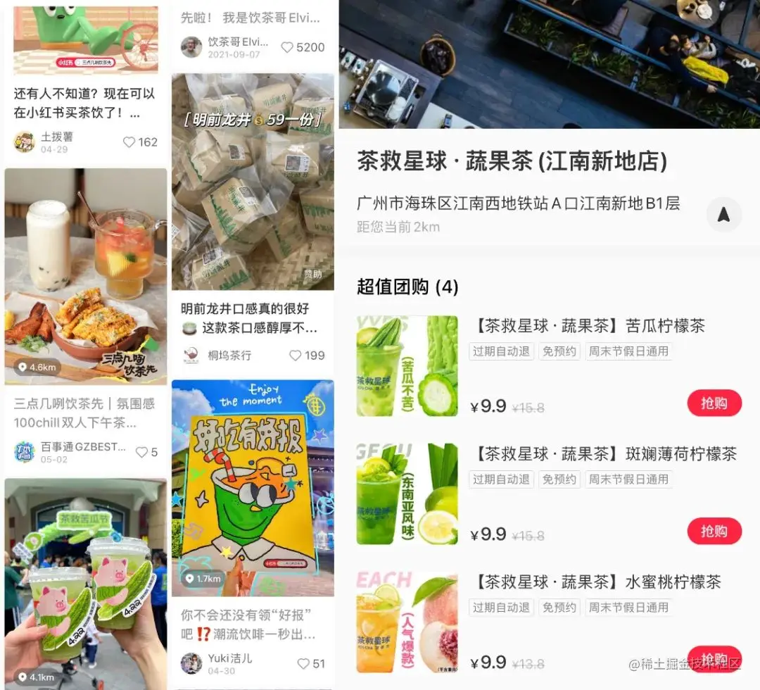 伯虎财经在小红书随机搜索“三点几咧饮茶先”,就能看到许多附带该标签的探店图文,而且不少内容下都直接附带了团购链接,点击即可进店抢购,实现站内交易。