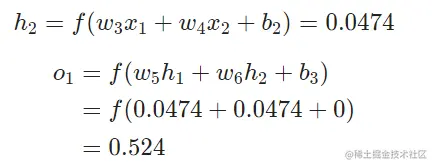 我们继续用前面图中的网络,假设每个神经元的权重都是相同的,截距项也相同(),激活函数也都是S型函数。(all neurons have the same weights w=[0,1], the same bias b=0, and the same sigmoid activation function)Let 1h1,h2,o1 denote the outputs of the neurons they represent.