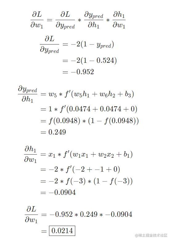 网络的输出是ypred=0.524,对于Male(0)或者Female(1)都没有太强的倾向性.Let’s calculate ∂L/∂w: