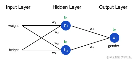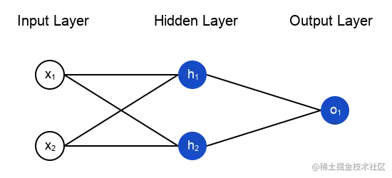 这个网络有两个输入,一个有两个神经元(h1和h2)的隐藏层,以及一个有一个神经元(o1)的输出层。