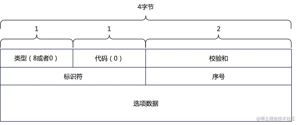 由于ICMP回显应答报文中会原封不动地返回ICMP回显请求报文中的标识符、序号和选项数据,因此在ICMP回显请求报文中,标识符字段使用客户端进程ID填写,用于判断接收到的ICMP回显应答是否为之前发送的ICMP回显请求的应答;序号字段从1开始,每发送一个回显请求报文累加1,用于统计发送ICMP回显请求的个数;至于选项数据则填写一个4字节大小的当前系统时间,用于计算ICMP数据报的RTT(Round Trip Time)大小。