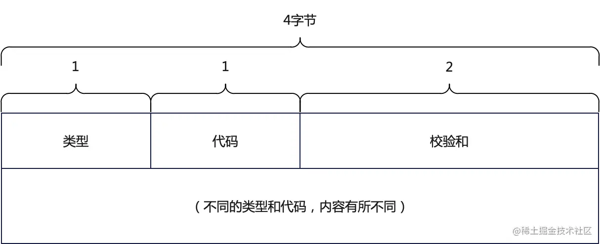 ICMP报文的格式如图1-2所示。所有的ICMP报文的前4个字节包含着相同的3个字段:1个字节的类型字段、1个字节的代码字段和2个字节的校验和字段。除去前4个字节,ICMP报文的其余内容会因类型和代码的不同而有所不同。