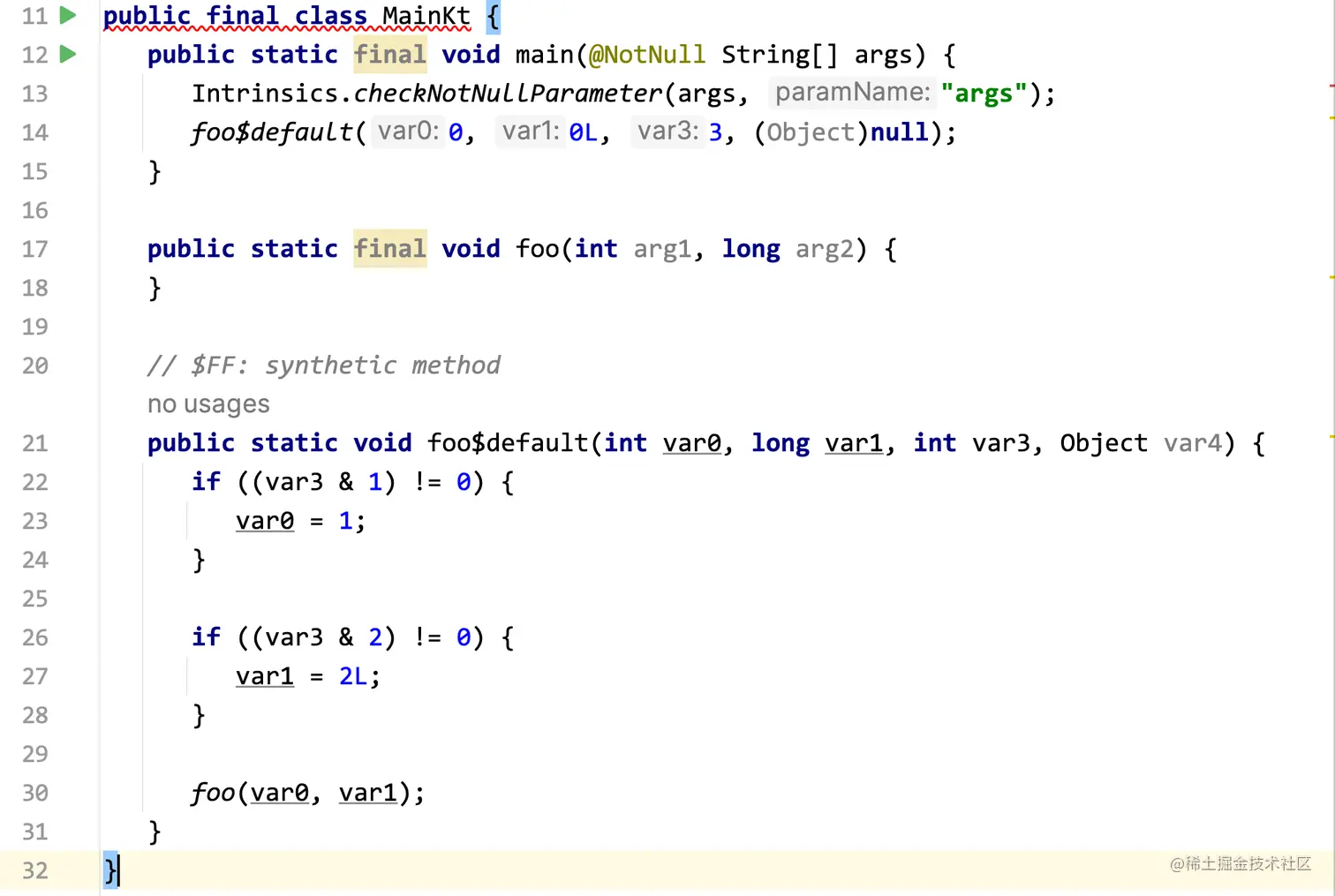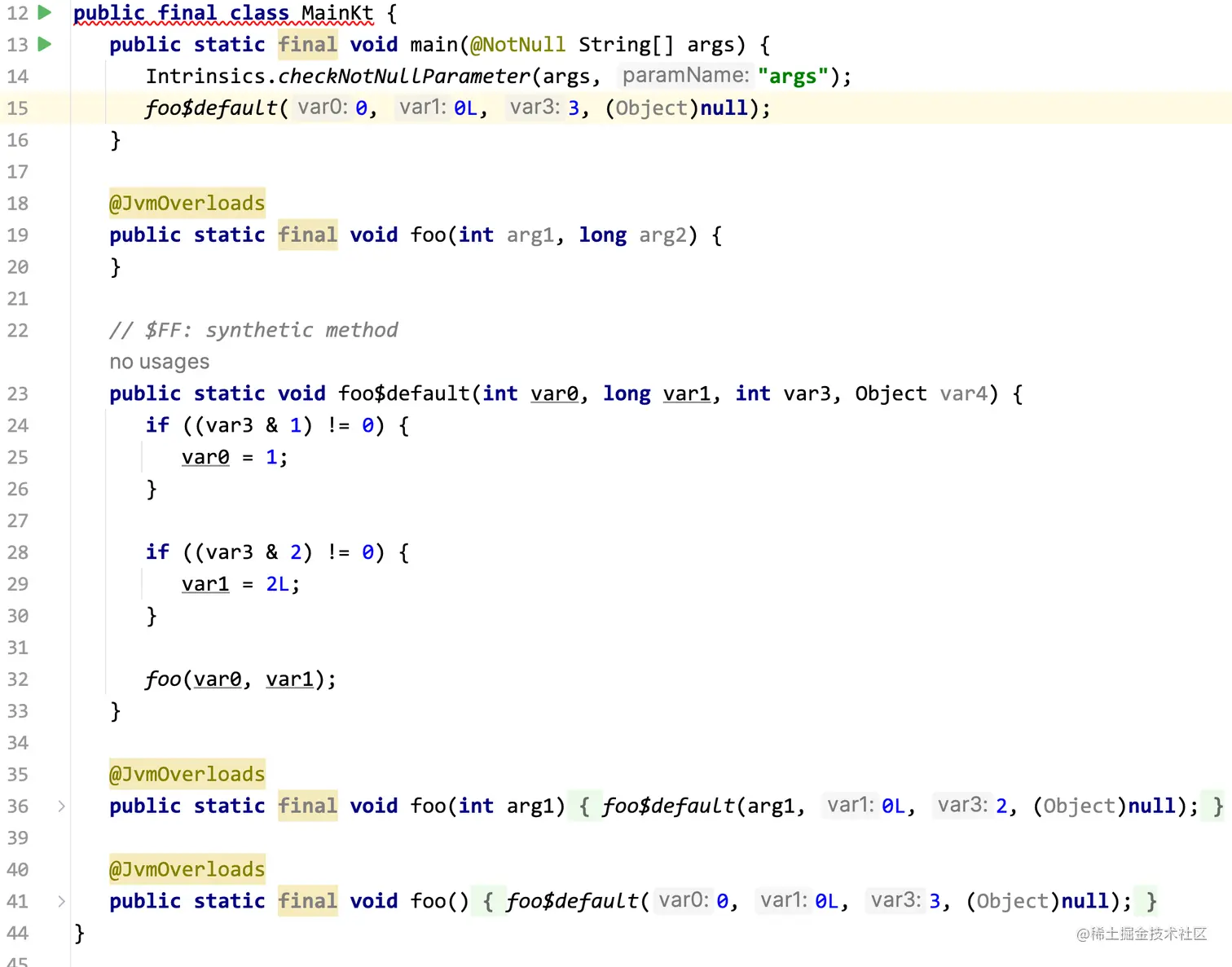 我们都知道,Kotlin的函数提供了默认参数这一特性,但是实现这一特性的原理是Kotlin在编译时,为我们把默认参数在调用处填了进去,而不是真正实现了多个参数的方法