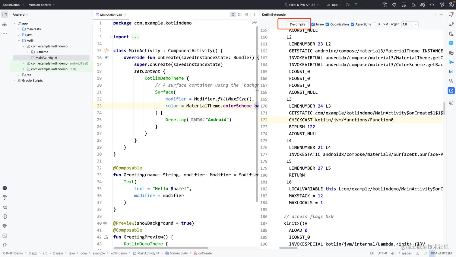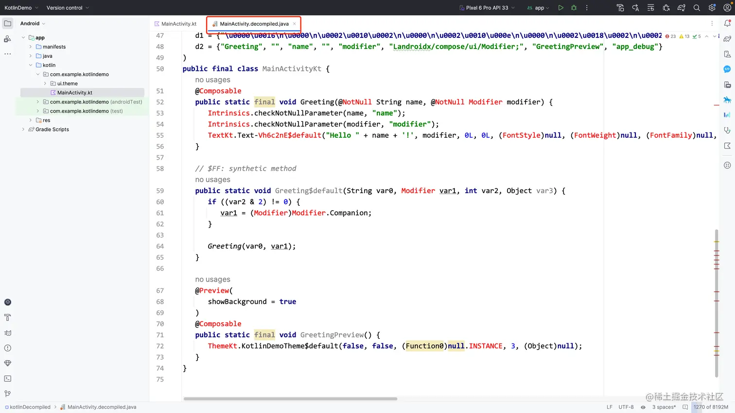 点击 Decompile ,就会展示当前Kotlin文件反编译到Java代码后的结果