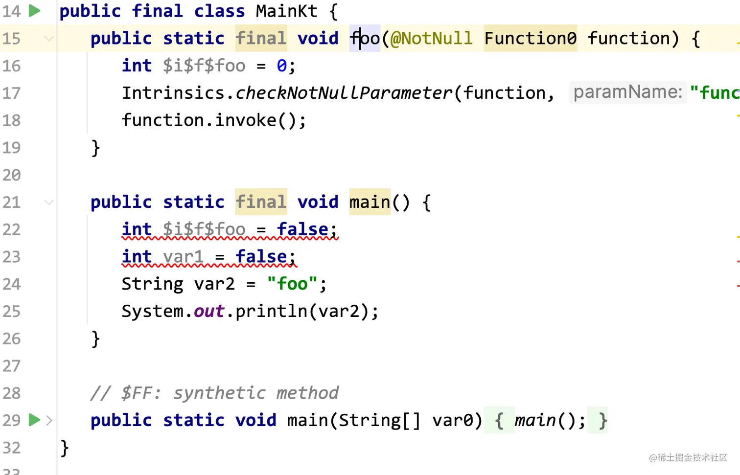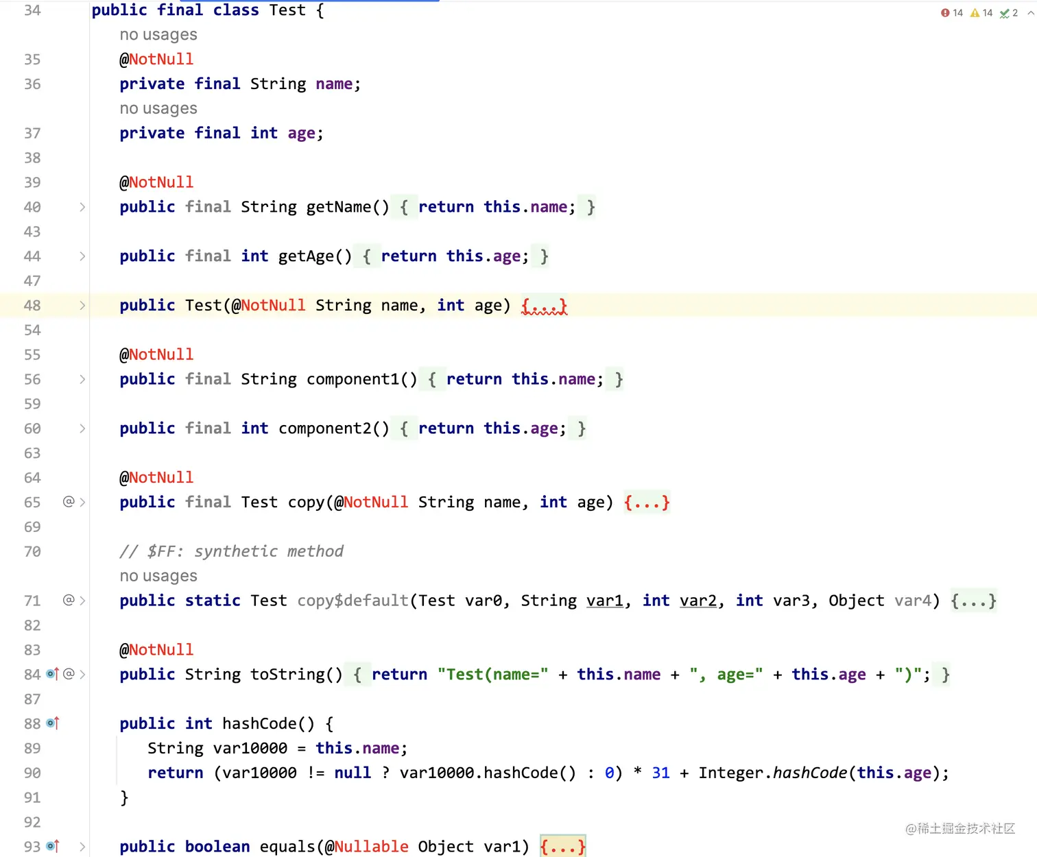 对于下面的代码,左边是Kotlin的原始代码,右边是反编译后的Java代码