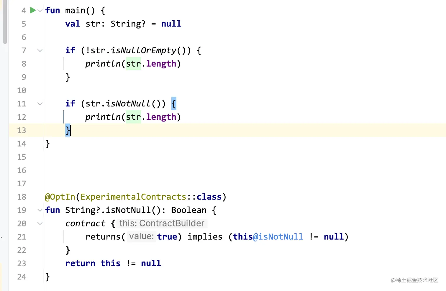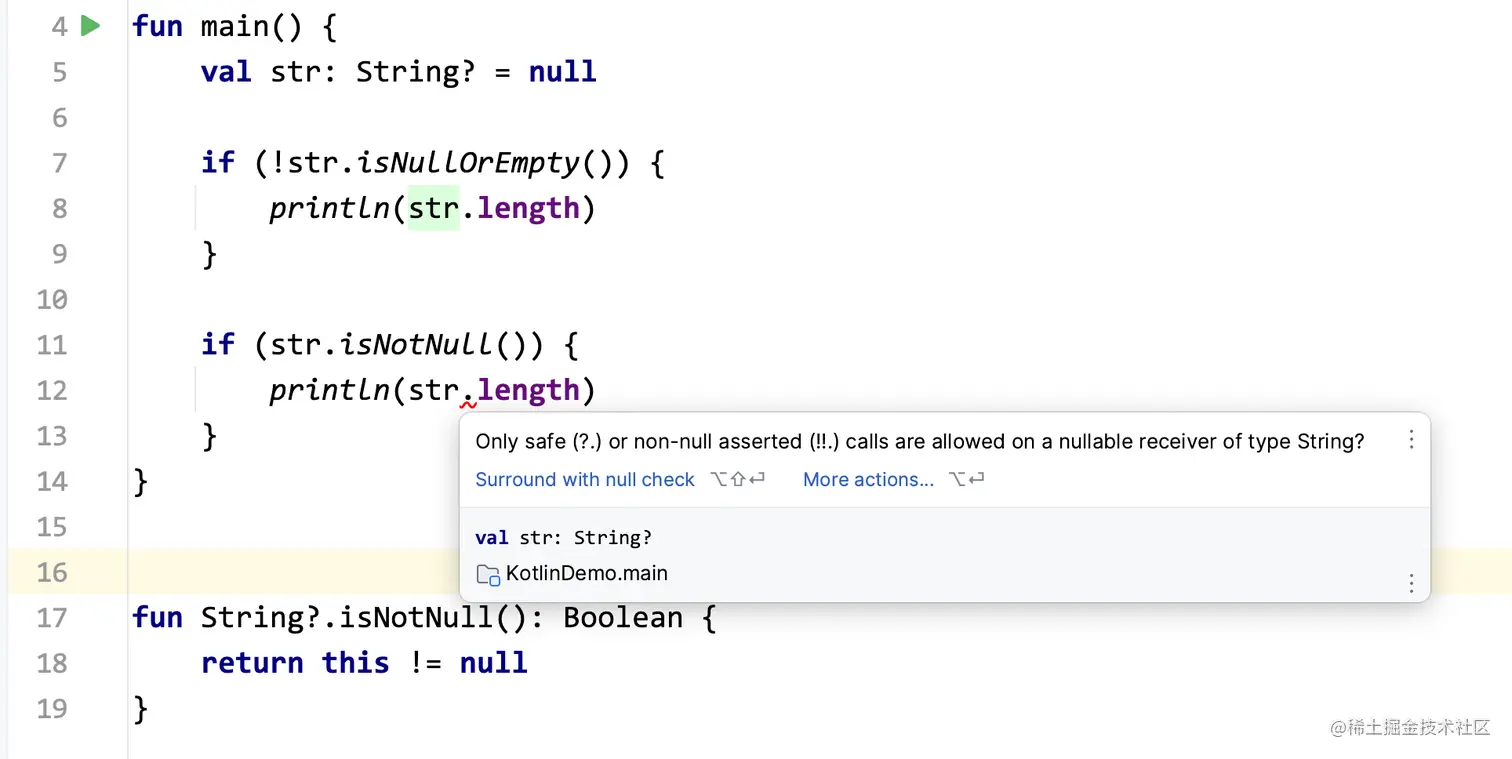 在开发的过程中,我们可能用过Kotlin提供的函数,比如像下面的isNullOrEmpty,当我们在使用它的时候,如果判断了它不是空,即使它的类型本身是可空的,但是编译器会帮我们做推断,进入到if分支里去后,str一定是不会为空的
