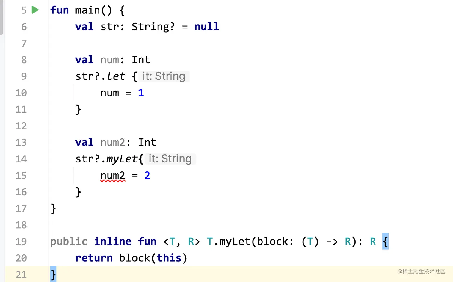 为什么Kotlin自带的let可以实现对num的赋值,而我们自己实现的myLet不行呢