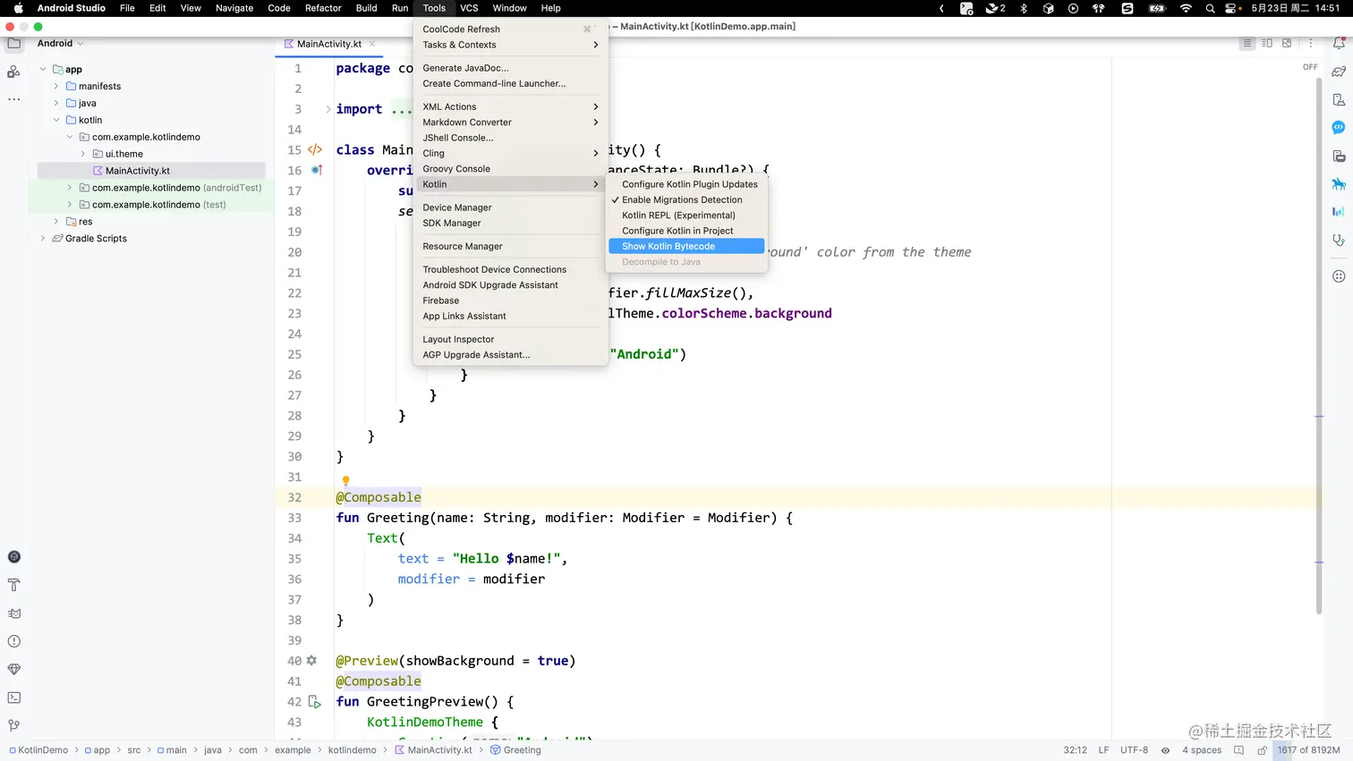 通过 Android Studio自带的Tools-> Kotlin -> Show Kotlin Bytecode