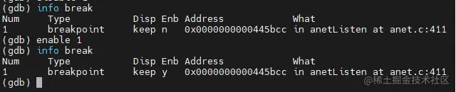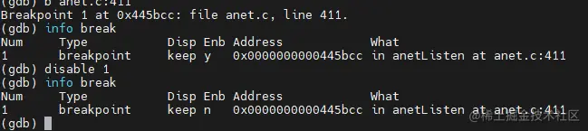 (gdb) disable 断点编号 // 如果不跟 断点编号,代表禁用所有, 断点编号用info break 指令可以得到