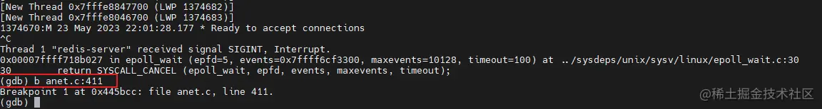 Ctrl + C 快捷键让 GDB 中断下来,例如我们使用run之后,想设置一个断点,就可以先用Ctrl + C 中断,然后就会返回gdb的界面