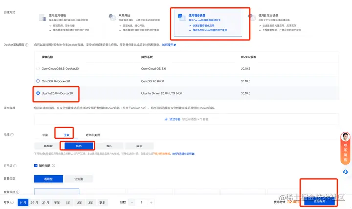 这个地方一定不要选择 中国 的服务器。。切记,可以在亚太里面选 先点击 【使用容器镜像】,接着选择【Ubuntu....】这个,在接着选择 亚太 东京的,最后在下面有一个否选已读协议的选择框,点一下,最后点击 【立即购买】即可。