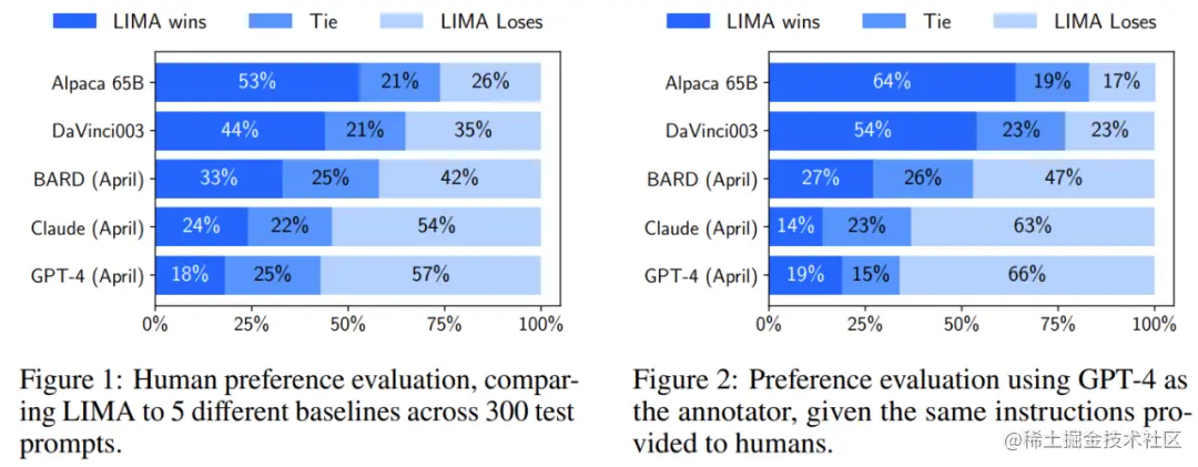 最后,虽然 Claude 和 GPT-4 通常比 LIMA 表现更好,但在很多情况下 LIMA 确实产生了更好的回答。值得注意的是,即使是 GPT-4 也有 19% 的情况更喜欢 LIMA 的输出。