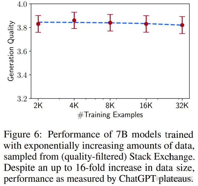 数量。增加实例的数量是在许多机器学习环境中提高性能的一个著名策略。为了测试它对该设置的影响,研究者从 Stack Exchange 中抽取了指数级增加的训练集。如图 6 所示,训练集规模的翻倍并没有改善回答质量。这个结果表明,对齐不一定只受制于训练样本的数量,还与 prompt 多样性函数有关。