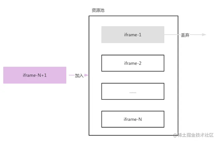 引入一个容量为N的Iframe资源池来管理多开窗口,当资源池未满时,新激活的窗口可以直接插入至资源池中;当资源池已满时,资源池按照竞争策略,淘汰若干池中的窗口并丢弃,然后插入新激活的窗口至资源池中。通过调整容量N,可以限制父应用主页面上多开窗口的数量,从而限制并发请求数量,实现资源管控的目的。