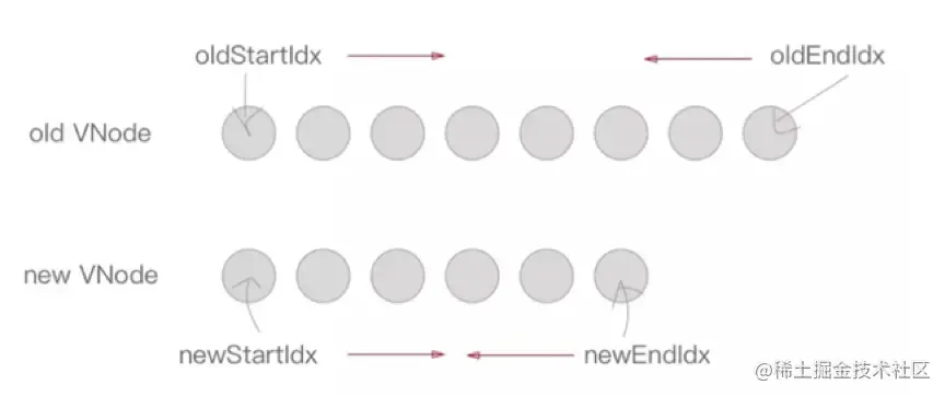 (4)咱们终于来到了主角updateChildren。在updateChildren内部实现中,使用了2套指针分别指向新旧Vnode头尾,并向中间聚拢递归,以实现新旧数据对比刷新。