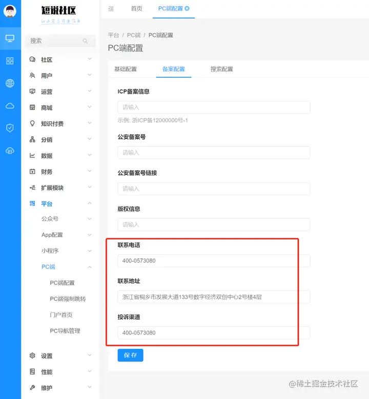 4.完善了备案信息配置,新增联系电话、联系地址、投诉渠道字段;