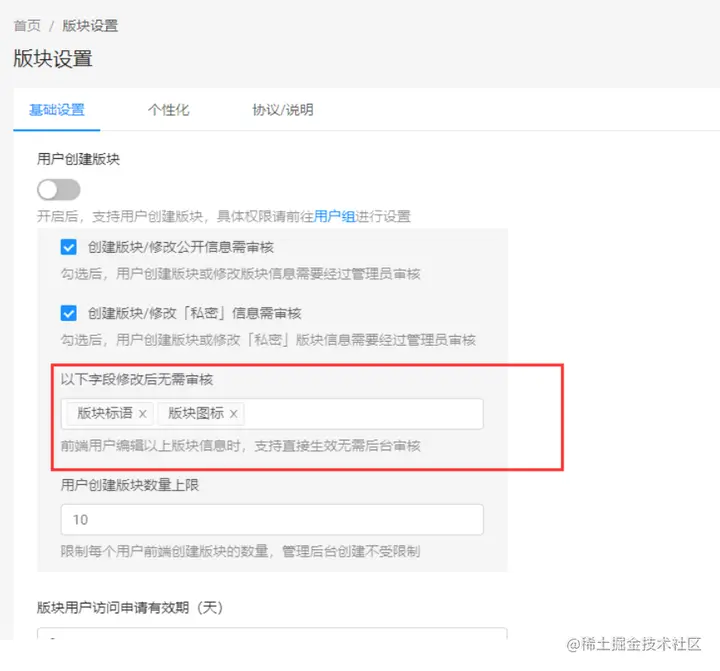 3.后台版块设置新增可配置用户端修改某些版块信息字段后无需再次提交后台审核的功能;