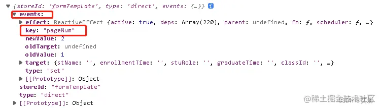 在开发者模式下,mutation中会有一个events对象,控制台可以打印出store的具体变化,key,newValue,oldValue等
