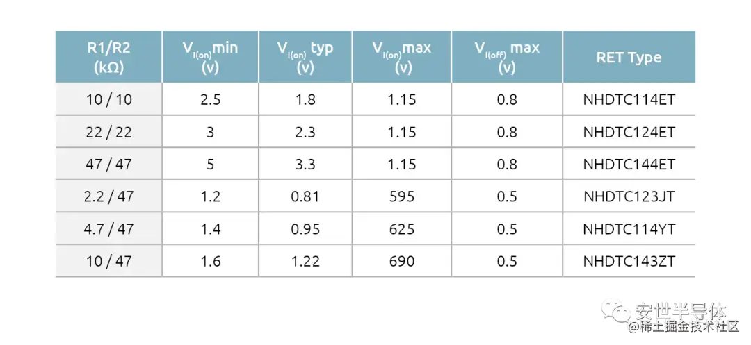 表 1 显示了导通和关断状态的输入电压对 Nexperia NHDTC 系列 RET 中的电阻分压器配置的依赖性。在 VI(off)条件下,会有一个微小的基极电流流过晶体管(约0.3 µA)。关闭 RET 所需的电压典型值与电阻比 R1/R2 有关。当晶体管关闭时,可以通过 R2 或基极-发射极二极管两端的压降目标来计算此值。对于 NHDTC 系列,该电压大约为 580 mV。因此,电阻比为 1 时的 VI(off) 值具有相同的电压(表1中的第1-3行)。由于上述原因,当 R2 为 47 kΩ,且 R1 值为 2.2 kΩ、4.7 kΩ 或 10 kΩ时,关断状态的典型电压值均会较低。VI(off) max 需为偶数值,以确保器件在图 2 中最左侧的深绿色阴影区域内运行。