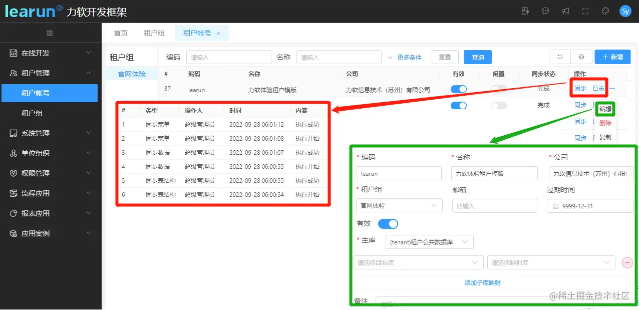 在租户账号管理模块界面,可以新增、编辑、删除、复制租户,对租户同步基础表结构、数据、菜单等,并记录日志。