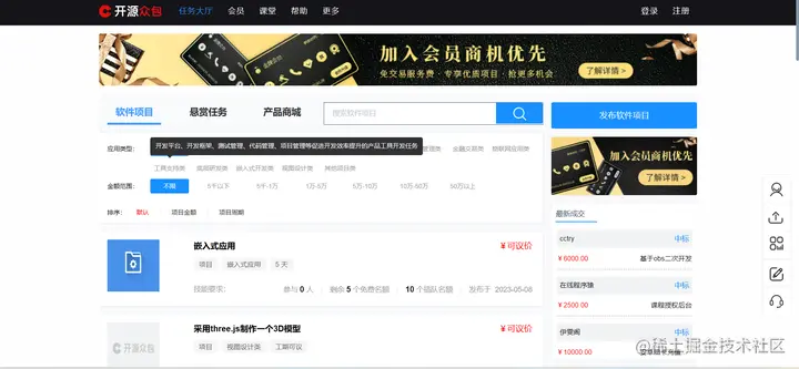 通过任务派单的模式进行程序员外包接单项目,体验十分有趣,需求人数、金额等都非常直观,一些热门的单子需要抢,在这里有时候可以淘到不错的项目。