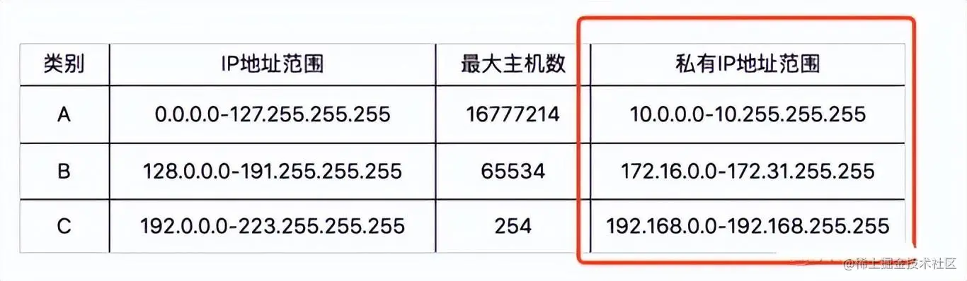 继续看上面的表格。表格最右列是私有 IP 地址段。平时我们在一个局域网内,看到的 IP 地址都是私有 IP 地址。因为这些地址允许组织内部的 IT 人员自己管理和分配,而且还可以重复。所以会出现你局域网的私有 IP 地址段和我局域网的是一样的。