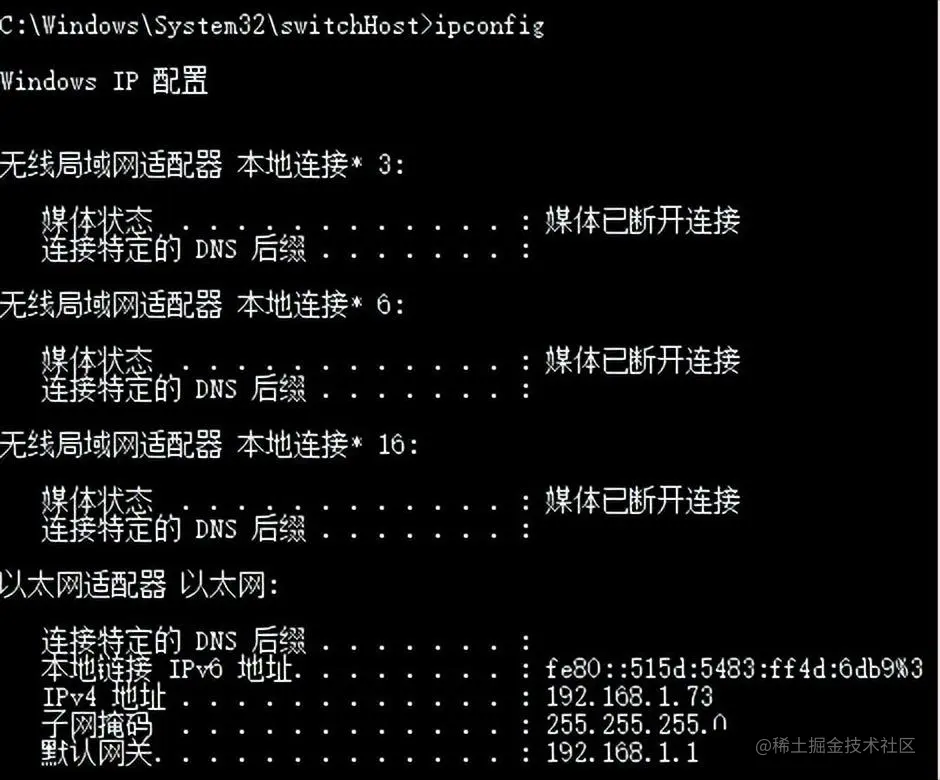 在 Windows 下输入 ipconfig,我们会看到这个界面: