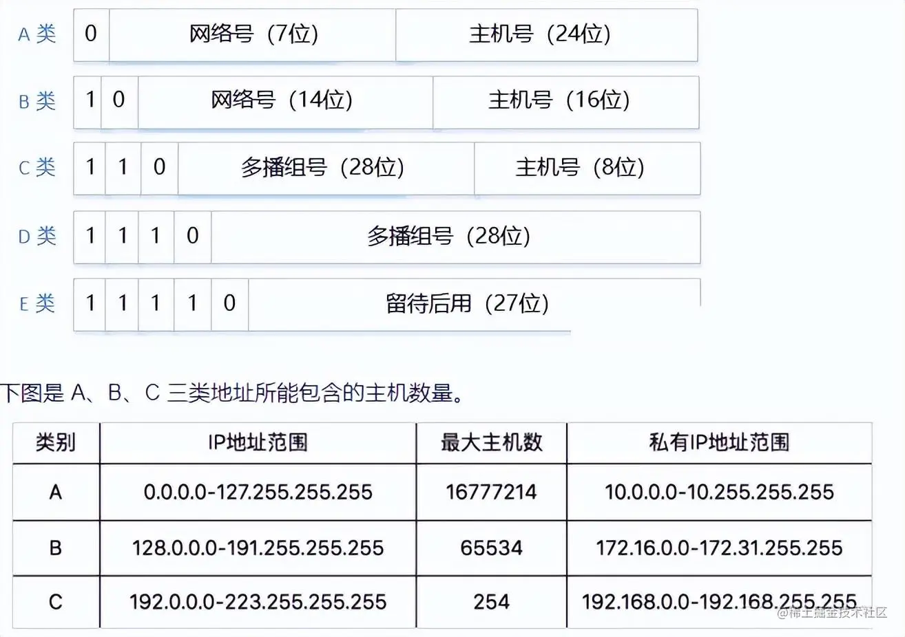 我们应该都听说过,IP 地址分为 A、B、C、D、E 五类。对于 A、B、C 类,主要分两部分,前面一部分是网络号,后面一部分是主机号。